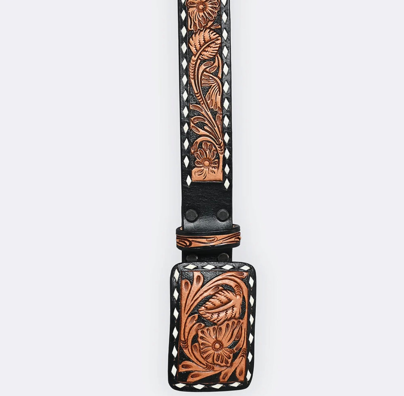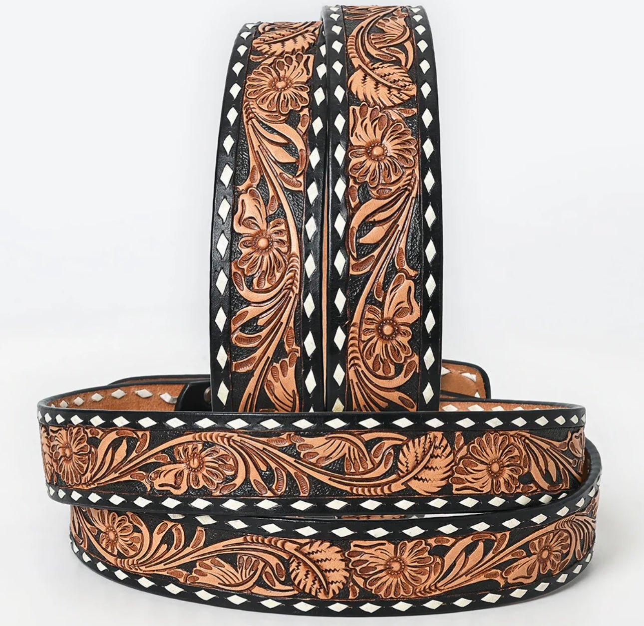•  Classic meets bold in this hand-tooled leather belt featuring richly carved floral and vine patterns on a striking black background. The warm saddle tan tooling pops with high contrast, framed in a distinctive white diamond edge. Designed for Western wear enthusiasts who appreciate authentic craftsmanship and standout style.