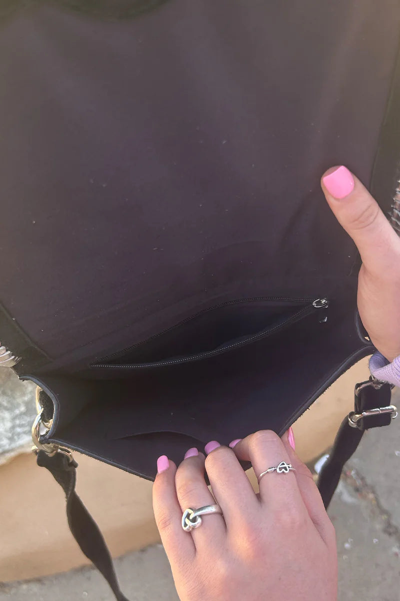 This unique Buckle Babe Bag is a perfect way to show off your style! Crafted with black leather and black cowhide with silver specks, it features a flashy silver tooled belt buckle look for an edgy, eye-catching finish. Ready to turn heads? Wear this bad boy and you'll be sure to do just that!