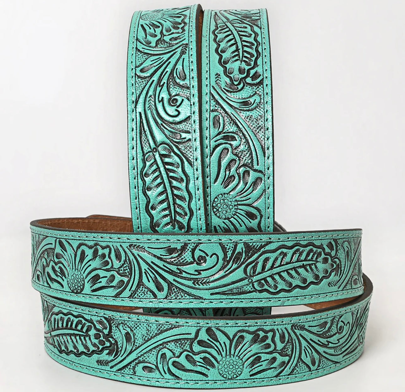 Bring bold color and authentic Western charm to your wardrobe with this stunning turquoise leather belt. Hand-tooled with floral and scroll designs, this belt showcases exceptional craftsmanship and a vibrant turquoise finish enhanced by black accents. The vintage-style oval buckle ties the look together, making it the perfect statement accessory for cowgirls, rodeo fans, and lovers of rustic fashion.