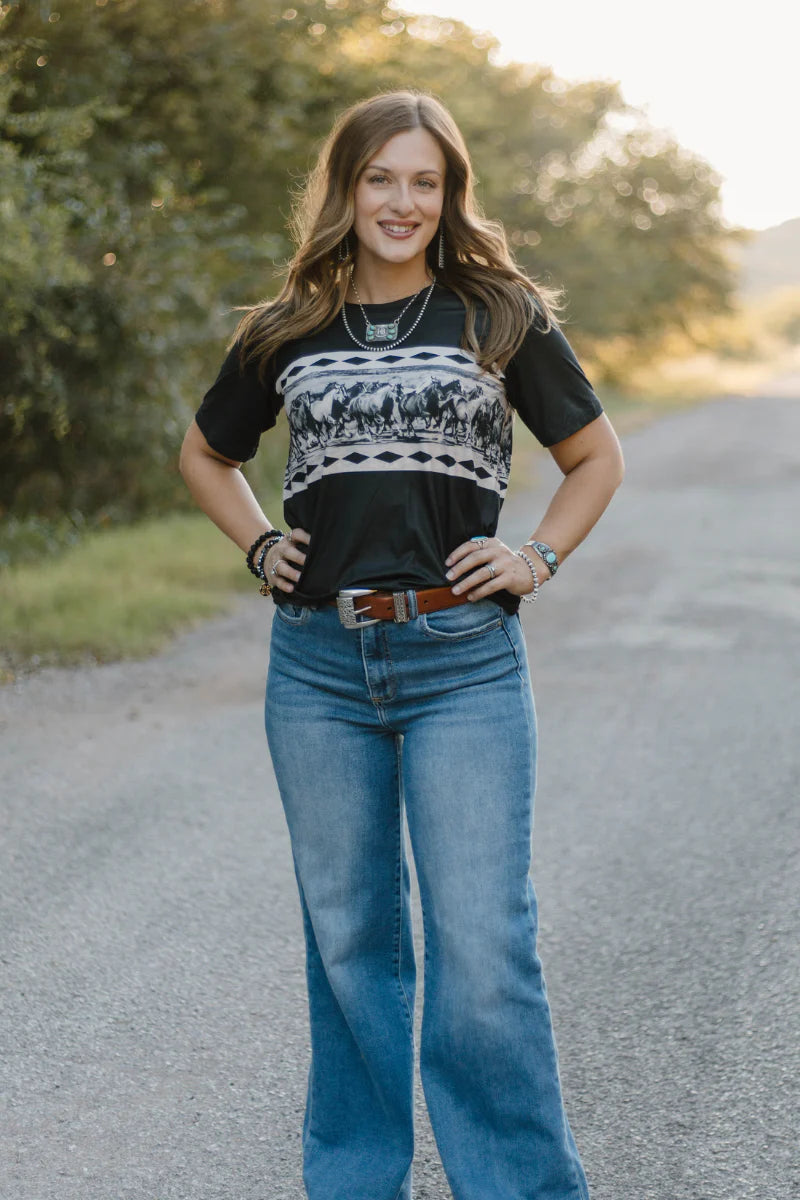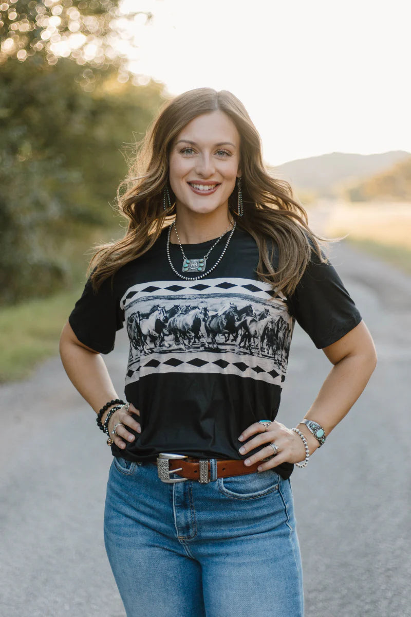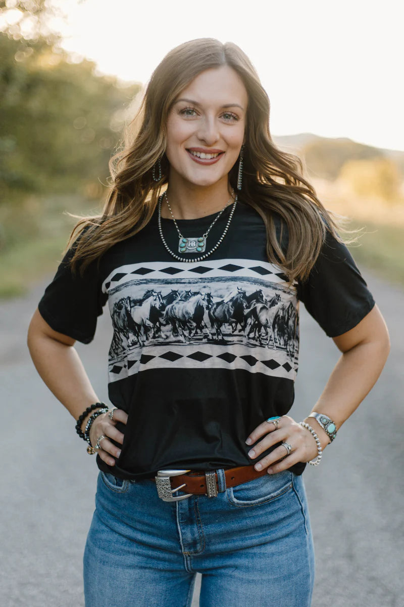 Embrace dynamic style with the Remuda Rush Top, featuring a striking design of a herd of horses in full run accented by subtle buck stitching. This black top brings energy and movement to your wardrobe, perfect for those who appreciate bold, western-inspired fashion with a refined touch.