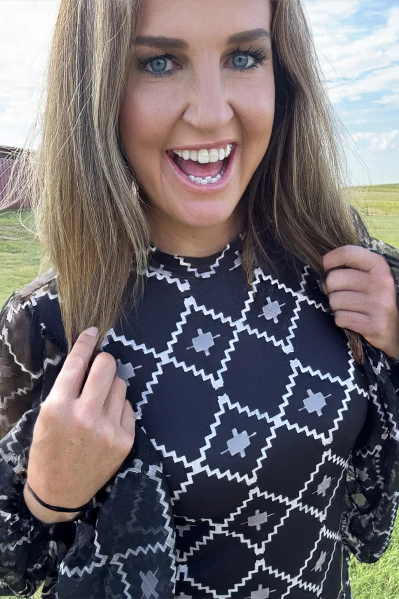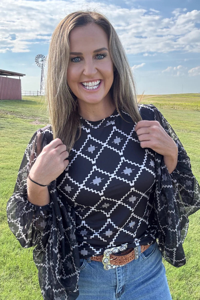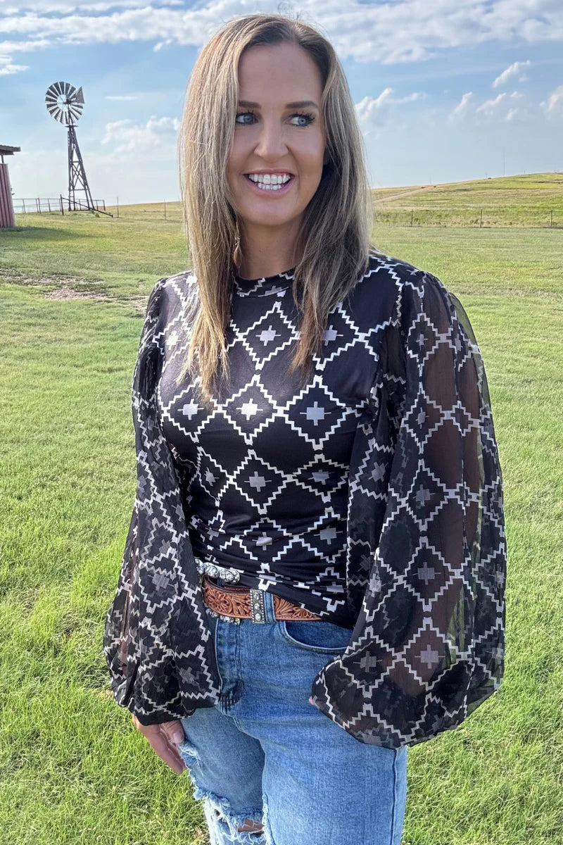 Elevate your style with The Way It Is Top, featuring a dynamic black and white Aztec pattern that adds bold, graphic appeal. The bubble sleeve design offers a trendy silhouette that balances volume with sophistication, perfect for making a statement anywhere. Lightweight and comfortable, this top effortlessly combines eye-catching style with easy wearability to enhance your everyday wardrobe.