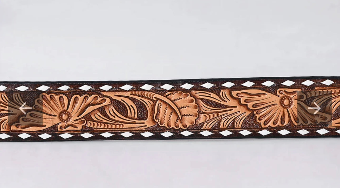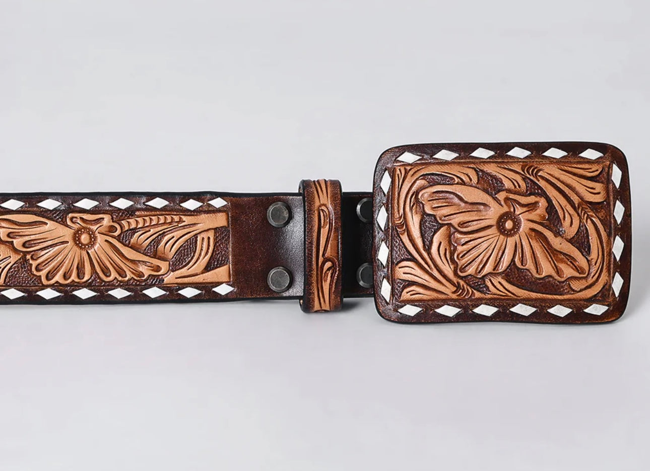Classic meets bold in this hand-tooled leather belt featuring richly carved floral and vine patterns on a striking black background. The warm saddle tan tooling pops with high contrast, framed in a distinctive white diamond edge. Designed for Western wear enthusiasts who appreciate authentic craftsmanship and standout style.