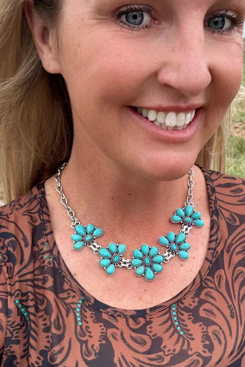 Add a pop of color to your outfit with this whimsical turquoise Flower Necklace. The cute stones make this necklace stand out from the rest, adding a touch of playfulness to any ensemble. Elevate your style and embrace your quirkiness with this beautiful piece.