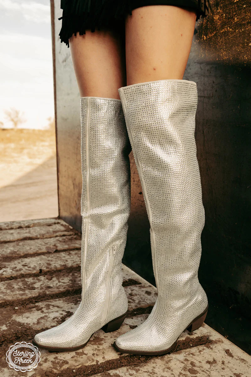 These silver Vegas Vibes Boots will turn heads - all without having to hit the jackpot! Show off your fashion-forward style with these chic thigh high boots. You're sure to feel as glamorous as Sin City itself!